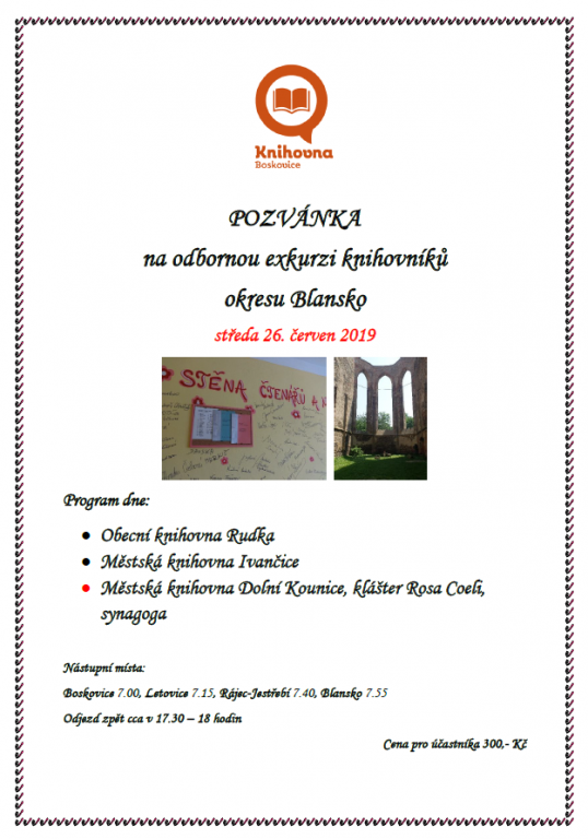 Ve středu 26.6.2019 se knihovnice paní Jiřina Vybíhalová zúčastnila odborné exkurze knihovníků okresu Blansko. Knihovníci navštívili Obecní knihovnu Rudka, Městskou knihovnu Ivančice, Městskou knihovnu Dolní Kounice, klášter Rosa Coeli a synagogu.